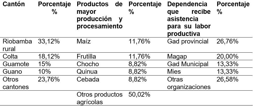 A continuación, se detallará los resultados más representativos obtenidos mediante la aplicación de 160 encuestas dirigidas a agricultores y/o artesanos que procesan alimentos agrícolas en la Provincia de Chimborazo. En la tabla N° 2 se establece que el cantón del que provienen los encuestados son en su mayoría: Riobamba rural, Colta, Guamote y Guano. Además, se muestra los mayores porcentajes de productos que se cultiva y/o procesa como son: maíz, frutilla, chocho, quinua, cebada. Por último, esta tabla muestra que de las organizaciones que reciben asistencia para su labor productiva son en su mayoría: el Gobierno Autónomo Descentralizado (GAD) Provincial, del MAGAP, GAD Municipal, Ministerio de Inclusión Económica y Social (MIES). Se debe considerar que del 100% de encuestados, el 50% manifestó recibir asistencia.
