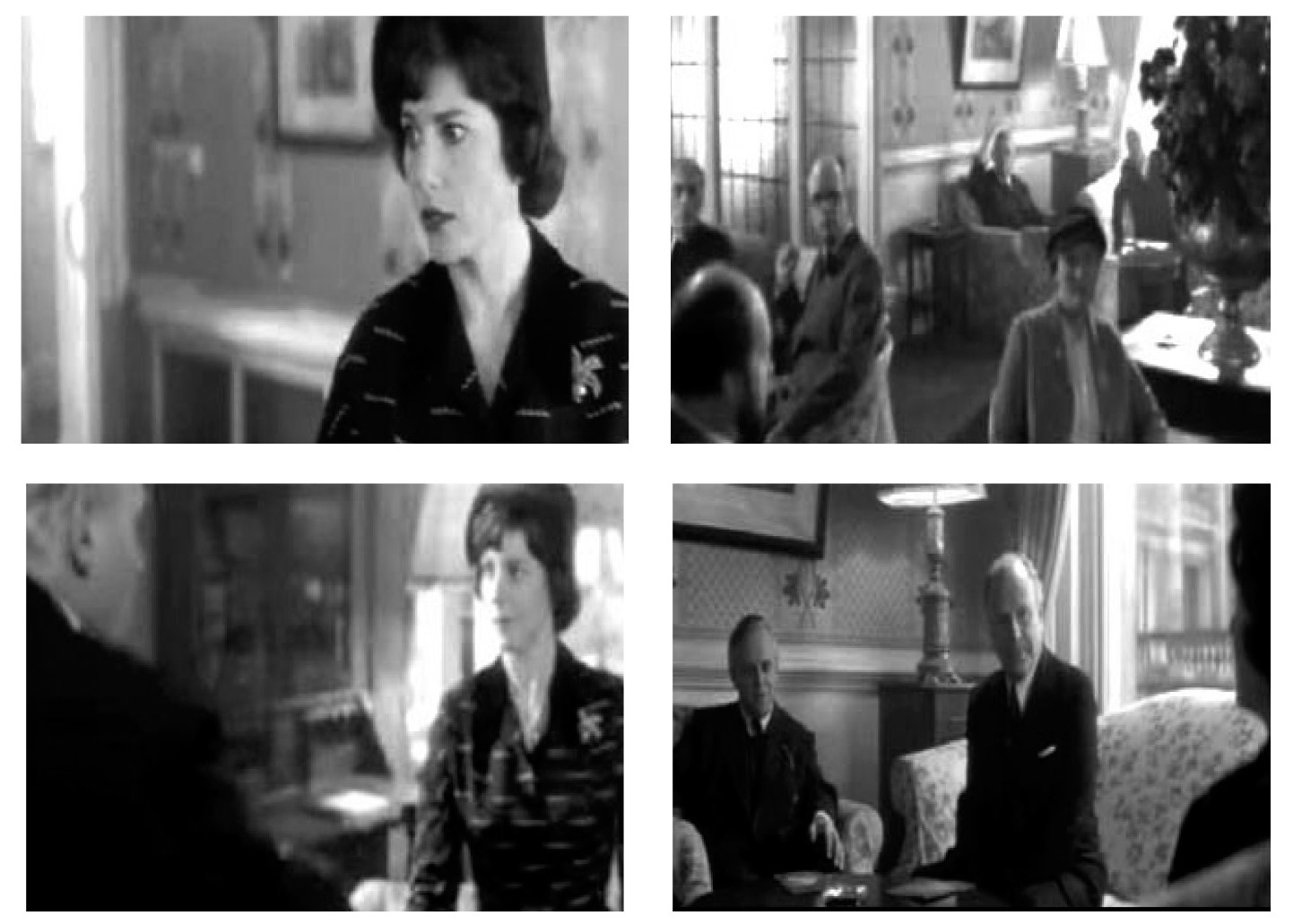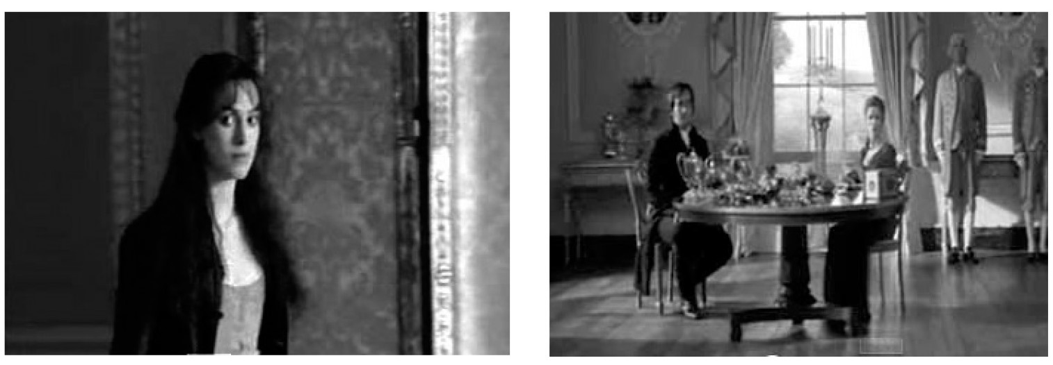 Ahora bien, con respecto a los diálogos, existen dos momentos en los que se simplifica notoriamente la tensión del suceso. El primero de ellos ocurre cuando Elizabeth llega a casa de Binbley en busca de su hermana enferma. Ella (completamente impresentable luego de haber caminado largos trechos bajo la lluvia desde su casa) le produce una mala impresión a la hermana de Binbley, quien murmura críticas contra ella. Se trata de un plano general y otro medio: ella de pie frente a la señorita Binbley y el señor Darcy (figura 5). El silencio prolongado entre los presentes transmite la tensión del encuentro, pero se echa en falta un plano detalle de la ropa húmeda o los zapatos sucios de la recién llegada.