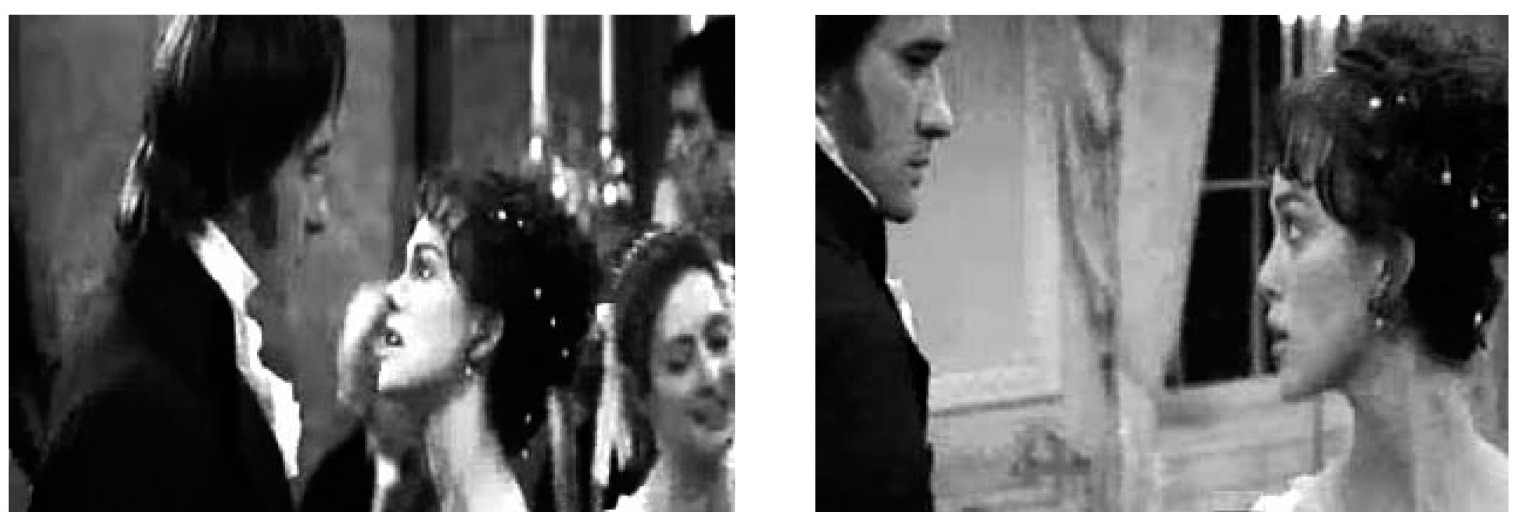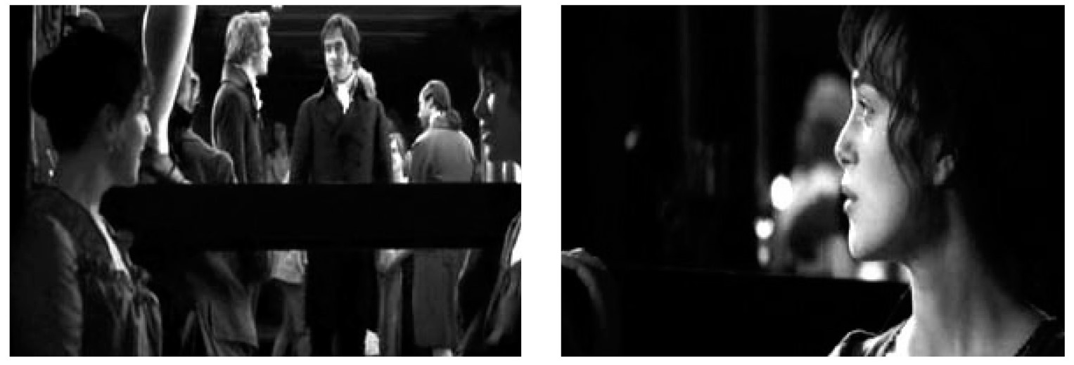 Un ejemplo de ello es también la escena en la que Elizabeth Bennet y su amiga Charlotte conversan; y de pronto, junto a ellas aparecen Darcy y su amigo (figura 3) al que comenta que ninguna mujer de la fiesta le parece atractiva y que la señorita Elizabeth tampoco le parece lo suficientemente bonita. Esta situación es especialmente descrita por la autora del libro y representada en la versión de Wright. En este caso, no sólo dos personajes hablan de otros que están presentes, sino que los aludidos también escuchan sus comentarios.