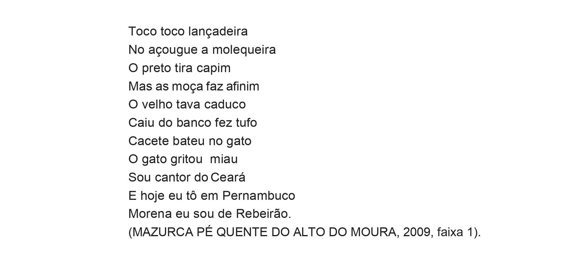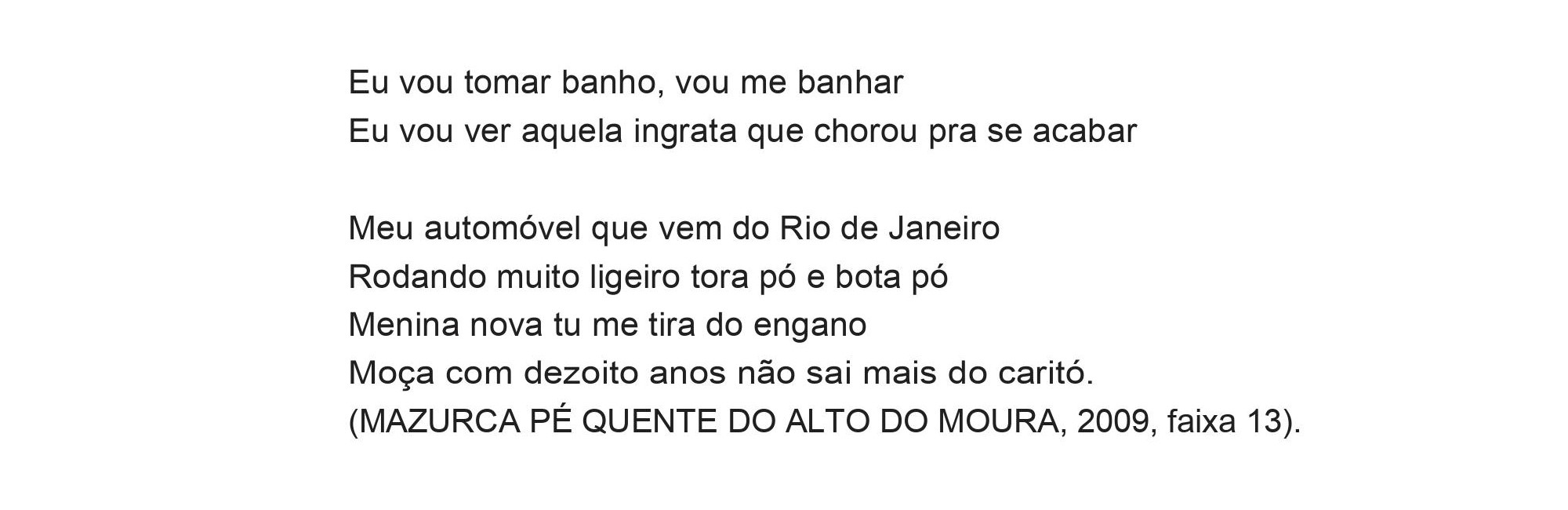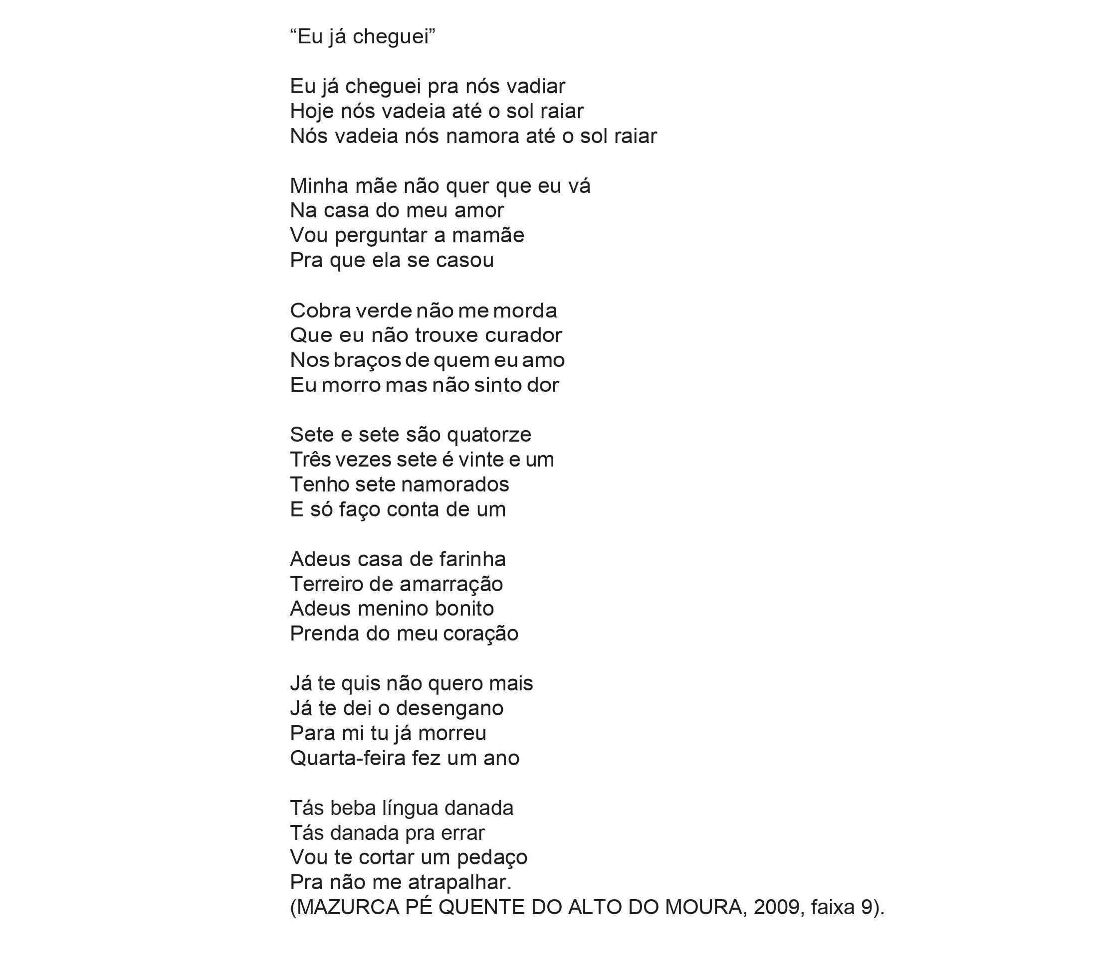 Apresentaremos aqui algumas letras de mazurcas que estão no CD Mazurca Pé Quente do Alto do Moura (2009) (Fig. 8). O CD está dividido em 15 faixas, de modo que algumas delas têm uma, duas ou até mesmo três loas diferentes. Apenas duas das músicas têm autorias conhecidas: “Somos do Alto do Moura”, faixa 6, de Lauro Ezequiel, e “Anda a roda”, faixa 7, que é um improviso de Manoel Aboiador (MAZURCA PÉ QUENTE DO ALTO DO MOURA, 2009). As demais músicas são de domínio público. Todavia, as/ os entrevistadas/os fazem questão de afirmar que elas foram compostas por pessoas da região e que foram passadas de uma geração para a outra, de mazurca em mazurca, e acabaram esquecendo quem as compôs (CÍCERO ARTESÃO, 2018; DONAHILDA, 2018; DONA MIÚDA, 2018; MANOEL ANTÔNIO, 2018; SEU DÃO, 2018).