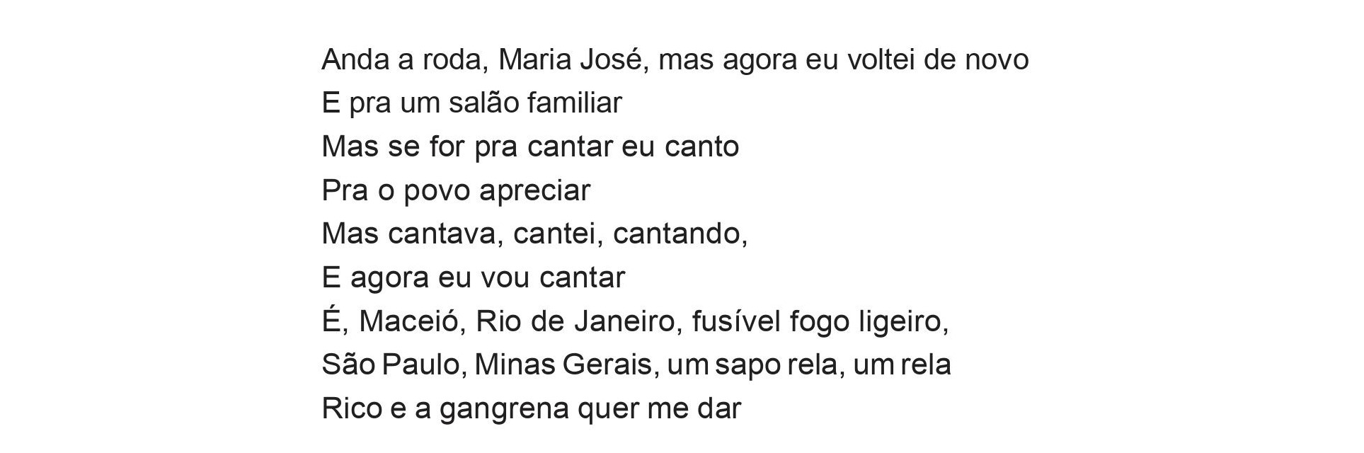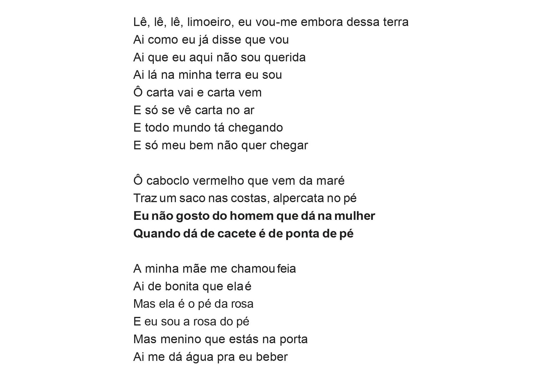 Contudo, a mulher também sabe se utilizar desses mecanismos, tanto para dizer o que sente, o que quer e o que não quer, como para fazer denúncias, mesmo que de maneira singela, como acontece em “Lê, lê, lê limoeiro”, puxada por Miúda.