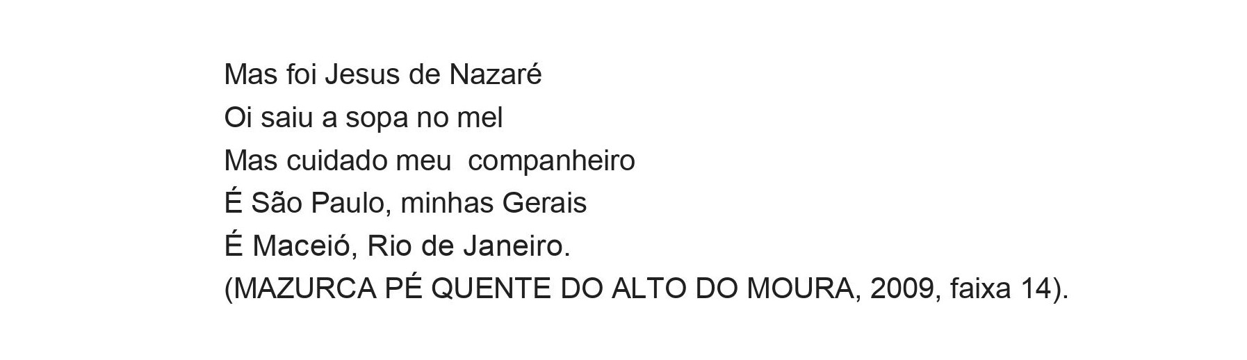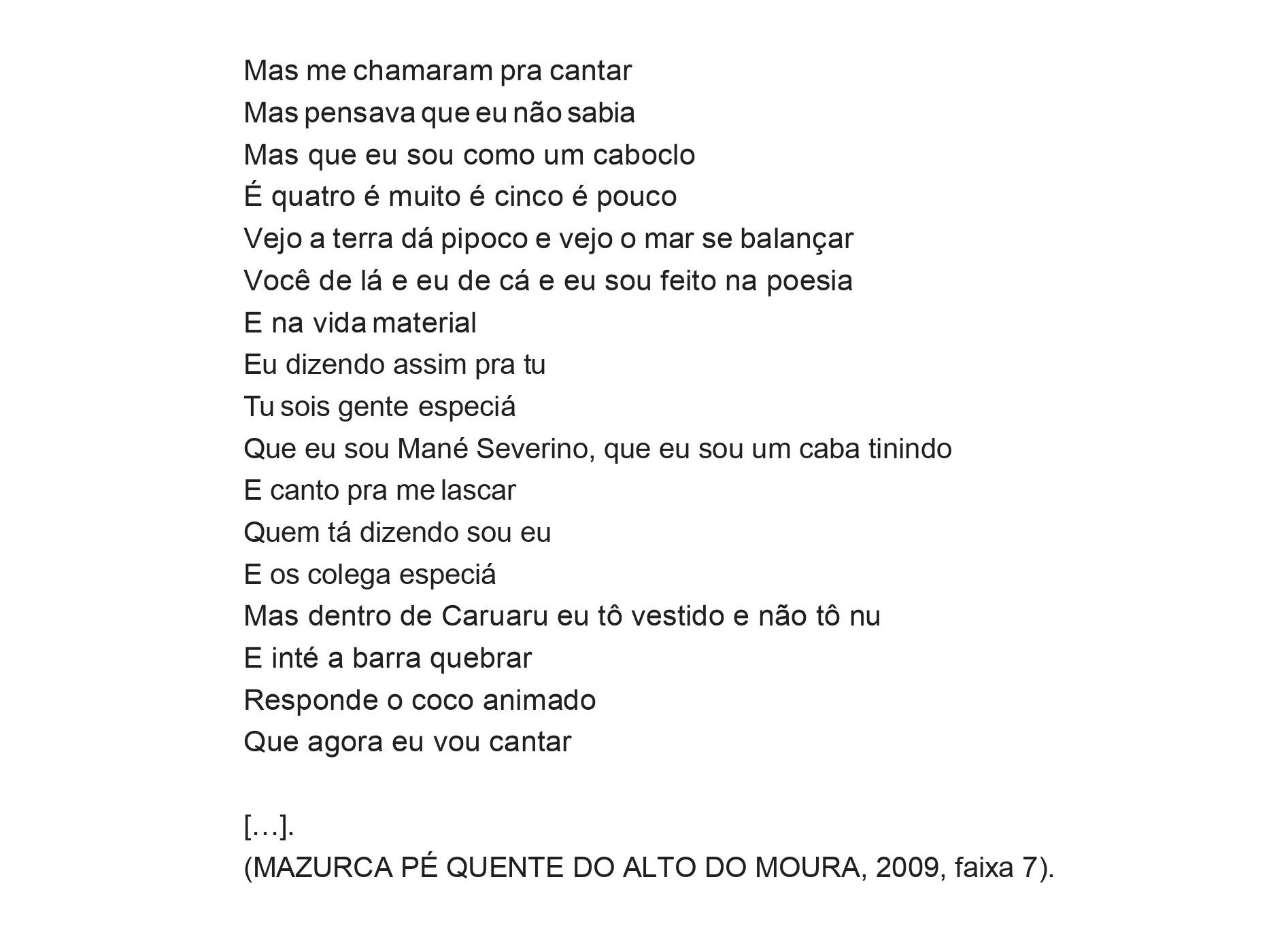 Para finalizar, não podemos deixar de apontar que, pelo menos no CD, quando a música – mazurca ou loa – traz uma visão geral sobre a cultura da comunidade, ela é entoada por homens. “Somos do Alto do Moura” (Fig. 9), puxada por Lauro, é praticamente o atual “hino” da Mazurca Pé Quente do Alto do Moura.
