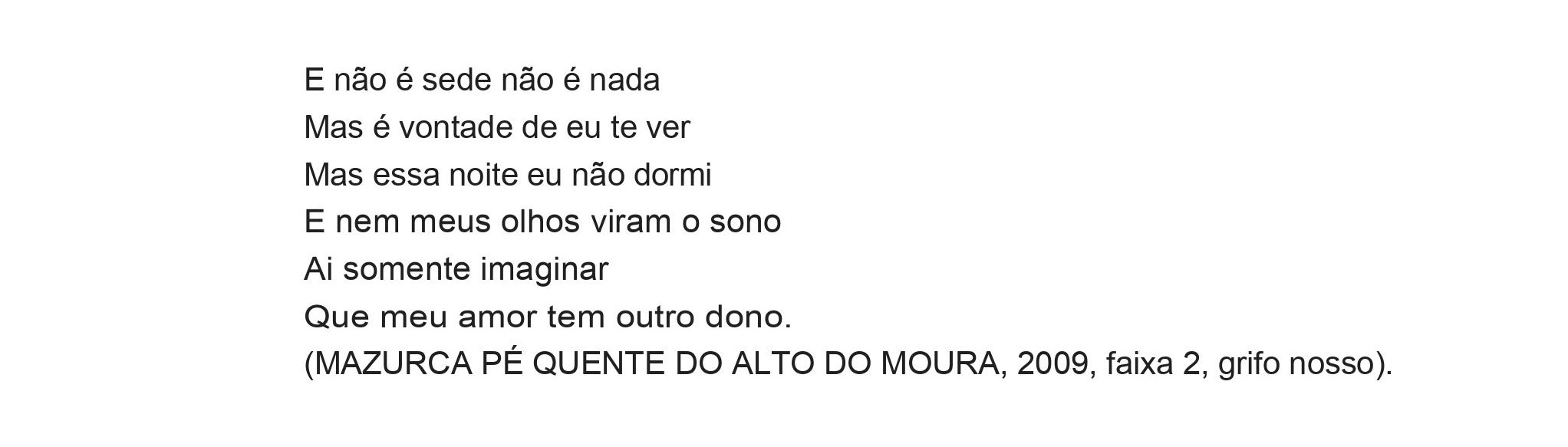 Ainda percebemos nesta canção a ameaça do caritó15, que é uma construção que faz/obriga a mulher a acreditar que ela só será feliz e completa se estiver casada (com um homem) e que, caso não consiga se casar (com um homem), estará desgraçada para a vida toda. Falando de canção, Greimas e Courtés (2011, p.91) afirmam que músicas como estas – com letra – são capazes de tornar o que foi cantado nelas algo que se repete social e culturalmente. Por isso também vemos como importantes e significativas as músicas com o eu poético “feminino”, mesmo que na hora da execução não haja uma preocupação se será puxada por uma mulher ou por um homem. A mensagem, o que a loa diz e de quem é a voz que ela representa são importantes.