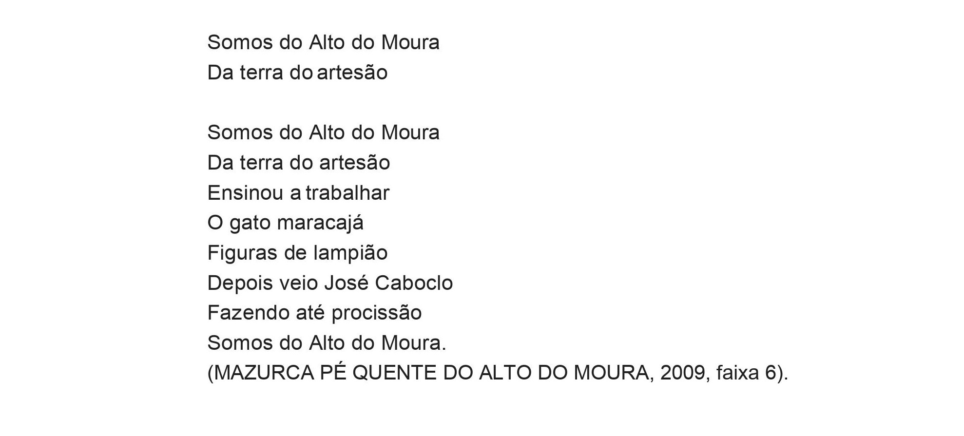 É de se esperar que Lauro tenha realizado a gravação dessa mazurca, visto que é de sua autoria. Porém, mesmo após seu falecimento, durante as apresentações por nós observadas, “Somos do Alto do Moura” sempre foi puxada por Cícero Artesão. Além disso, como pode ser observado na letra, as figuras lembradas são somente masculinas.