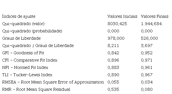 Mediante os dados obtidos é possível observar, na Tabela 1, que todos os índices (razão Qui-quadrado / Graus de Liberdade, CFI, GFI, NFI, TLI, RMSEA, RMR) foram significativos após os ajustes realizados.