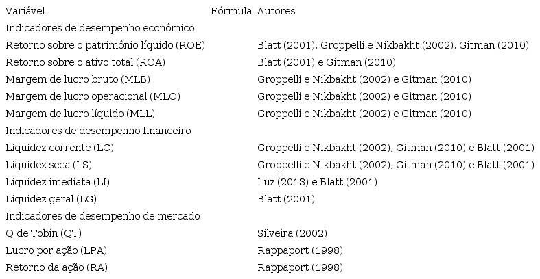 A coleta dos dados para o cálculo dos indicadores econômicos, financeiro e de mercado ocorreu por meio da base de dados Economática. Na Tabela 1 pode-se observar as variáveis (índices) utilizadas no estudo, fórmulas, bem como os autores que as utilizaram em estudos relacionados.