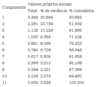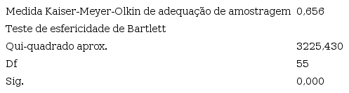 Obteve-se pelo teste de esfericidade de Bartlett um valor p de 0,000, ou seja, menor que o nível de significância de 0,05, rejeitando-se, portanto, a hipótese de que não há correlação entre as variáveis suficientes para a utilização da Análise Fatorial. Adicionalmente, o teste KMO, que mede a adequação da utilização da Análise Fatorial para a base de dados, apresentou um valor de, aproximadamente, 0,656, e de acordo com Pestana e Gageiro (2003), o KMO de 0,60 demonstra que há uma correlação razoável entre as variáveis. Nesse caso, os resultados apresentados (KMO e teste de esfericidade de Bartlett) indicam que há um nível de correlação entre as variáveis do presente estudo suficiente para a utilização da Análise Fatorial.