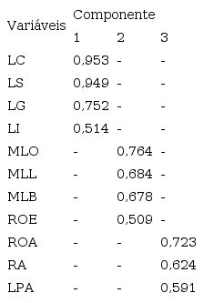 O resultado referente ao objetivo geral demonstrou que a análise fatorial gerou três fatores de agrupamentos de indicadores de desempenho. O primeiro fator refere-se ao desempenho financeiro, o qual agrupou os indicadores de liquidez corrente, liquidez seca, liquidez imediata e liquidez geral, conforme Groppelli e Nikbakht (2002), Gitman (2010), Blatt (2001) e Luz (2013). Desta forma, não se rejeitou a hipótese H2 (Os indicadores de desempenho liquidez corrente, liquidez seca, liquidez imediata e liquidez geral correspondem ao agrupamento de desempenho financeiro das empresas brasileiras analisadas).
