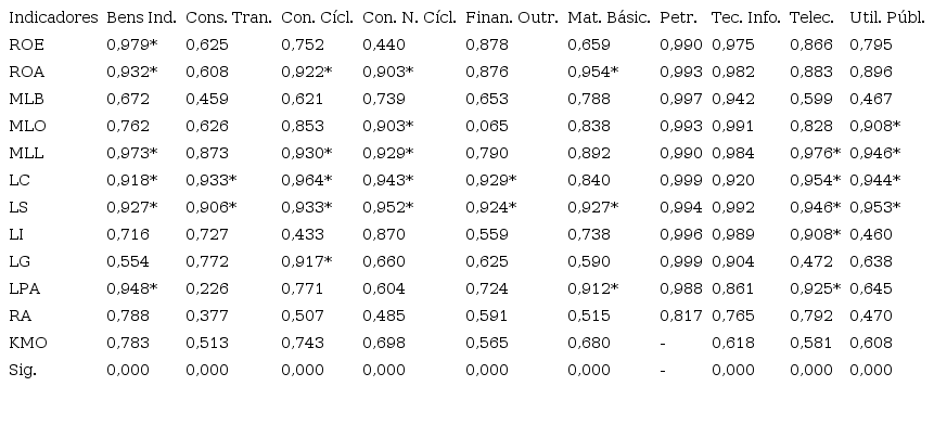 Os valores das comunalidades, quanto mais próximo de 1 estiverem, representam maior poder de explicação dos fatores, o que pode sugerir maior relevância de determinado indicador para cada setor analisado. Dessa forma, com base nas comunalidades de cada setor com valores entre 0,9 e 1, verificam-se os indicadores de desempenho com maior relevância para eles.