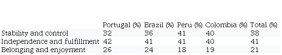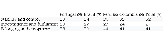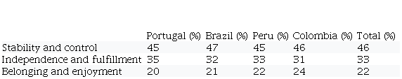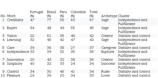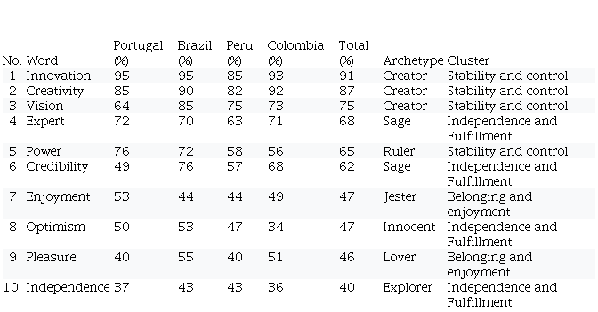 The analysis of the chosen words showed that the most relevant clusters of archetypes are Stability and Control (44 percent), Independence and Fulfillment (30 percent) and Belonging and Enjoyment (26 percent), as shown in Table V.