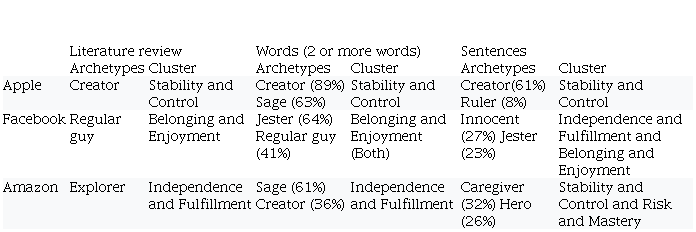 We also showed that the consistency of results in the analyzed brands is significantly higher for word associations – that is, archetypes are more similar –, than in the sentences which Mark and Pearson (2001) used to characterize the different archetypes. We found the biggest differences in Facebook and Amazon brands, while for Apple the consistence of perceptions is significant (see Table XII).