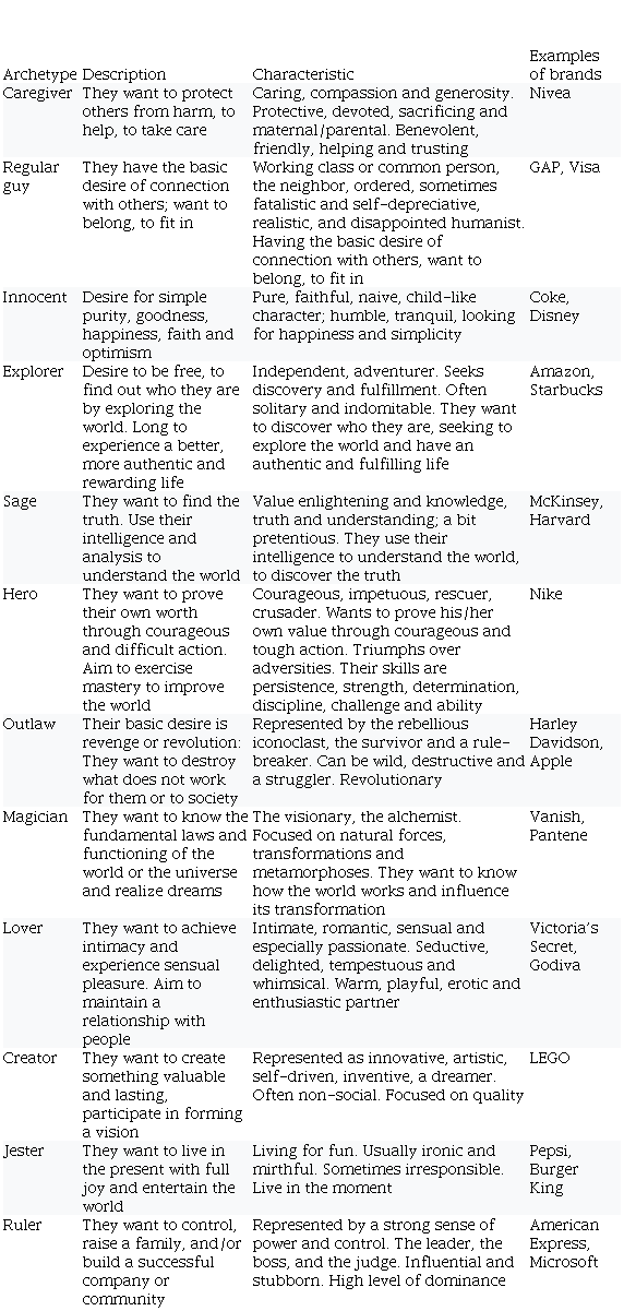 Brand archetypes are part of brand personality. Marketing managers may use an archetypal approach to brand personality in order to define what a brand is, what it stands for, and the relationship with its consumers, thus providing a real meaning associated with their customers’ desires and motivations (Mirzaee and George, 2016; Mark and Pearson, 2001). In an archetypal approach, the focus is on the customer’s brand experience and brand meaning, and the products are merely secondary means to achieve the expected brand meaning (Högström et al., 2015). Consumers’ individual brand perceptions are influenced not only by their exposure to a marketer’s brand stories, and to the media and pop culture, but also by personal experiences and word of mouth (Adi et al., 2015). These external influences lead to different