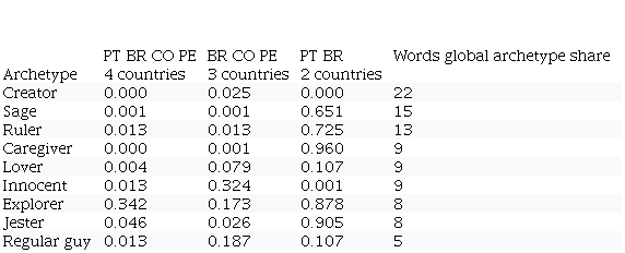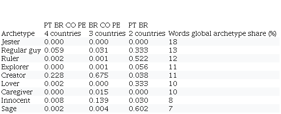 The authors measured consumers’ perceptions in different cultural contexts through a survey, and received 537 valid questionnaires from Portugal, Brazil, Colombia and Peru, countries that have some similar indicators of cultural proximity. The authors wanted to verify if the words and sentences that respondents related to each brand were coherent with the archetype/brand, and the homogeneity of the results in different cultural contexts.