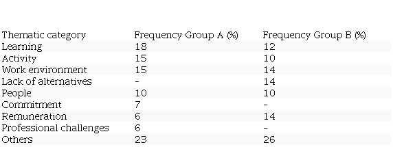 The answers of these two groups were separately submitted to the content analysis with the technique thematic category. In total 214 units of registry were generated. Group A (with no intention to leave) generated 164 units of registry that generated 31 themes and eight categories, only eight participants of this universe did not answer this question. Group B (with intention to leave) generated 50 units of registry, 14 themes, and 7 categories, only 4 responders of this universe leave this question unanswered (Table IX).