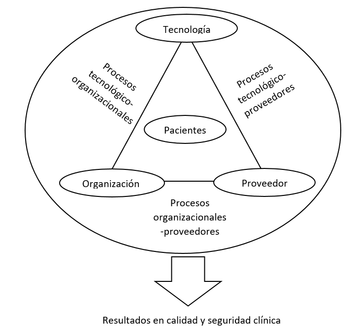Un modelo reportado en la literatura y denominado como el Triángulo (Ancker et al., 2012), (Ver figura 1) parte de la premisa de que los resultados sobre la efectividad de las intervenciones TIC en salud no son concluyentes, en parte, por la dispersión de enfoques de evaluación usados. Así, los autores apoyados en el modelo de Avedis Donabedian, que enfatiza una perspectiva sistémica de los determinantes de la calidad en salud, proponen un enfoque que evalúa la calidad y seguridad en los resultados de intervenciones TIC en salud.