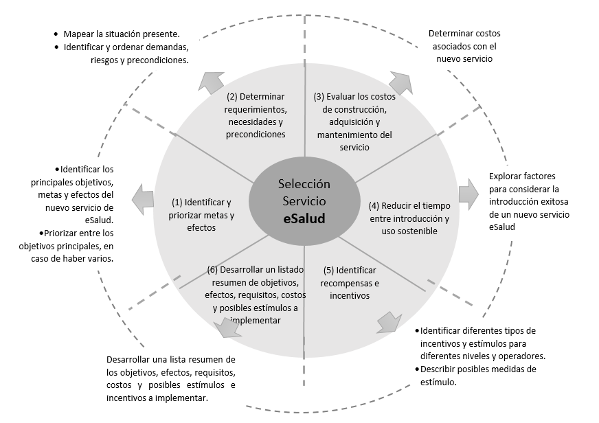 También se encontraron enfoques con fuerte énfasis clínico-administrativo (Haddad et al., 2013). Específicamente el propuesto por Mettler & Vimarlund, (2017) (Ver figura 2) entiende las intervenciones eSalud en la lógica de servicios y negocios, es decir, la tecnología como un producto que las organizaciones adquieren. Basado en seis pasos, el modelo propuesto está preocupado no tanto por los resultados, como por las decisiones de adopción tecnológica. Su argumento parte de que la selección y priorización de los servicios en eSalud es el primer momento para lograr una evaluación holística del impacto de los servicios de salud electrónica y, por lo tanto, el énfasis debe concentrarse en esta fase.