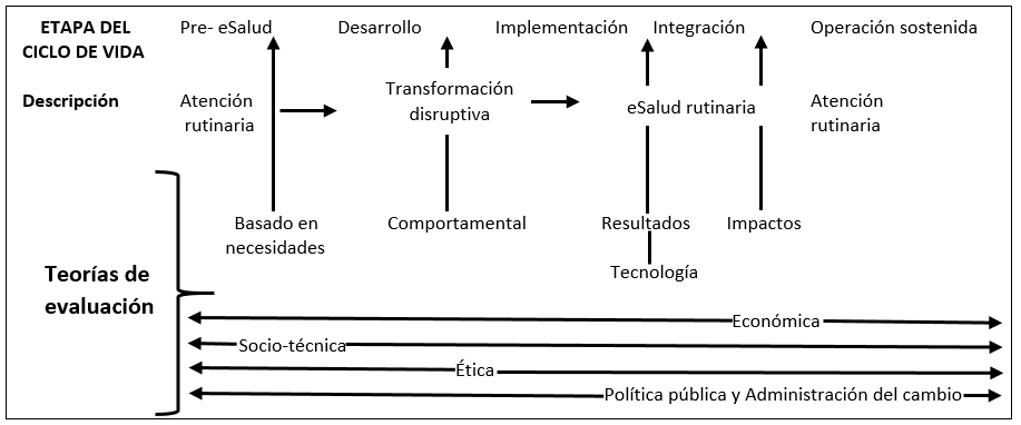 En concordancia con la perspectiva previa, pero esta vez más ingenieril, el enfoque a continuación se basa en el ciclo de vida de una tecnología electrónica en salud para evaluar sus posibles impactos en un proceso continuo de realimentación. Denominado como el Enfoque Khoja et al. para evaluación en eSalud (Khoja et al., 2013) (ver figura 3). Este resume los argumentos a considerar en una matriz que espera servir de orientadora para la evaluación de las intervenciones en todos los momentos. La evaluación se basa en cuatro formularios diferentes aplicados a públicos particulares (Ej: gerentes, proveedores de atención médica y clientes) para medir resultados de los servicios de salud, tecnológicos, económicos, conductuales, socio-técnicos, éticos, políticos y de preparación para enfrentar el cambio.