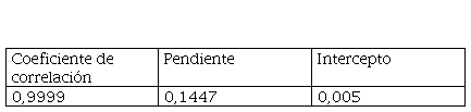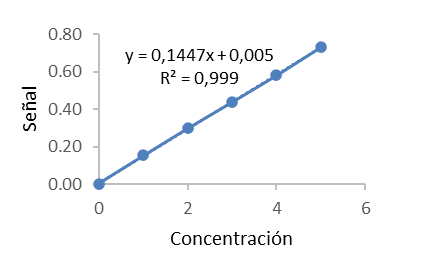 Como se puede evidenciar en la Tabla 5, los resultados obtenidos en la curva de calibración garantizan un ajuste lineal positivo, considerando el coeficiente de regresión lineal (R2 > 0,999). Esto demuestra que los valores obtenidos son aceptables.