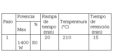 Para la digestión de muestra de pescado se adecuó el método propuesto por (Shah et al., 2012), utilizando 0,3 g de muestra liofilizada. Posteriormente, se añadió en el vial de teflón, 1 mL de ácido nítrico concentrado (HNO3), 1 mL de peróxido de hidrógeno concentrado (H2O2) y 1 mL de ácido perclórico concentrado (HClO4). A continuación, se acondicionó el programa de digestión. En la Tabla 1, se presentan las condiciones utilizadas para esta digestión