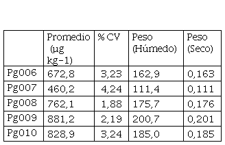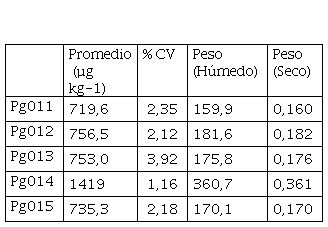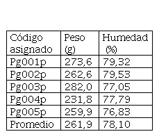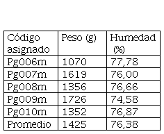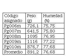 de humedad de las muestras, en la cual se reporta el peso de cada una y el promedio total de las cinco diferentes muestras de pescado pargo, por tamaños. A cada pescado se le asignó un código respectivo para su identificación, donde se indica el nombre de la especie (PG), el número de muestra (001) y el tamaño del pescado (p). Como se ve en la tabla 2 se determinó el peso de las muestras de pargo pequeño cuyo valor promedio fue de 262 g, y el porcentaje de humedad fue de 78,10 %.