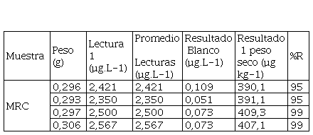 La reacción de generación de vapor se dio empleando SnCl2 en medio ácido como agente reductor (Pohl et al., 2008). Las muestras se analizaron por triplicado y las lecturas por duplicado. Además, por cada lote de 11 muestras se leyó un material de referencia certificado (MRC) DORM-4 fish protein, National Research Council Canadá y un blanco. Finalmente, se programó el software para la inyección automática de las muestras previamente digestadas en microondas.