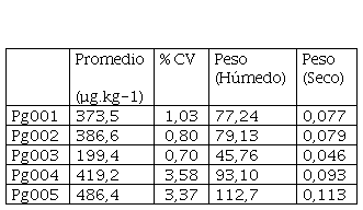 A continuación, se detallan las concentraciones de mercurio total obtenidas en las muestras de Pargo (Lutjanus colorado) que se expenden en el mercado América de la ciudad de Quito (Tabla 7). Se obtuvieron valores de mercurio total en peso seco de 199,4 µg kg-1 ± 0,70 hasta 486,4 µg kg-1 ± 3,37; mientras que la concentración en peso húmedo fue entre 45,76 µg kg-1 ± 3,03 hasta 112,7 µg kg-1 ± 14,6. Finalmente, se obtuvieron valores entre 0,046 mg kg-1 ± 3,01 hasta 0,113 mg kg-1 ± 14,5 de mercurio total en peso húmedo o peso fresco de pescado pequeño.