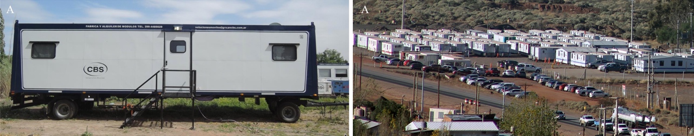 La “casa contenedor” mueble radica en un módulo habitacional, que puede o no hacerse con un contenedor o buque marítimo, y, que puede ser móvil o fijo. En el primer caso se monta sobre un tren rodante y en el segundo sobre patín de arrastre. En estos módulos residen cuatro a seis personas, que generalmente son hombres. Cuentan con dos habitaciones provistas con dos camas individuales cada una, generalmente cuchetas, y televisor; un baño con ducha y una kitchenet integrada a un pequeño espacio para comer. Así nos lo explican trabajadores de la industria: