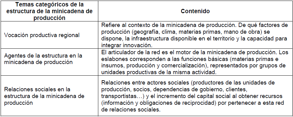 Para la vinculación entre teoría y evidencia empírica, la identificación de la estructura de las minicadenas productivas se conformó de la vocación productiva regional, el articulador de la red, los eslabones (producción, transformación y comercialización), las relaciones sociales entre agentes y los recursos (información y reciprocidad) que los participantes tienen a su disposición para incremento del capital social. Durante este proceso de identificación, se tuvo presente en primer lugar, que el estudio de las relaciones sociales, ya sea en una comunidad o al interior de una organización, implica aceptar las desigualdades sociales, lo que requiere de cierta familiaridad con lo que sucede en la esfera de estudio (Flick, 2007), lo cual estuvo cubierto con la experiencia y la cercanía en campo de quienes esto escriben. En segundo, que el contexto está en la vocación productiva regional, vital para el análisis cualitativo de datos, ya que la experiencia de una situación particular es el objetivo principal del conocimiento fenomenológico (Moustakas, 1994)