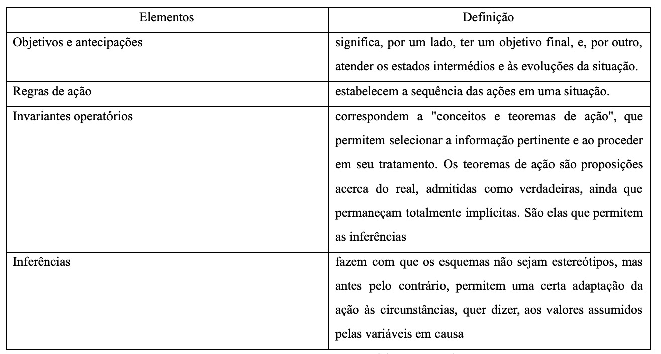 Vergnaud (1990) considera que toda atividade humana tem uma organização invariável, para se adaptar a inúmeras situações. Logo, ele deu origem a relação entre esquema-situação, de forma sine qua non o esquema relaciona-se com a situação, sendo precisamente estruturados conforme o quadro 1.