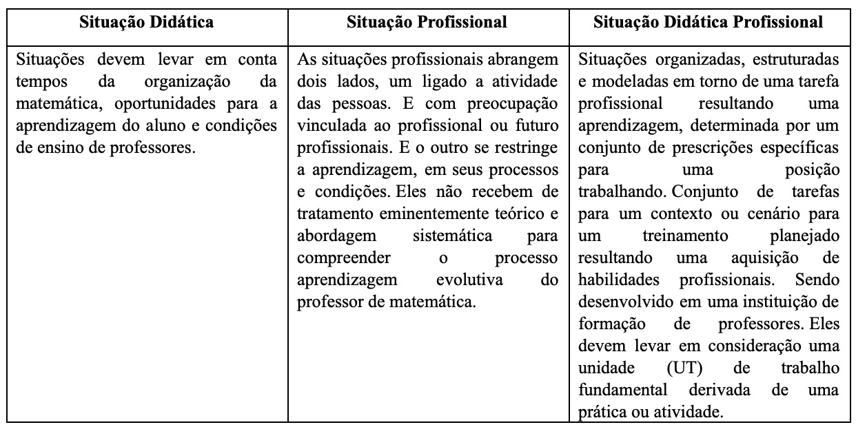 Na situação didática, vinda da Teoria das Situações Didáticas ( BROUSSEAU, 1986) retém o interesse em um conjunto de situações fundamentais capazes de conceituar a matemática. Logo, no que se concerne a atividade do professor também é possível encontrar uma variedade de situações que vai depender da atividade executada pelo o mesmo, em sala de aula ou externa a ela, denominada de Situações Profissionais.