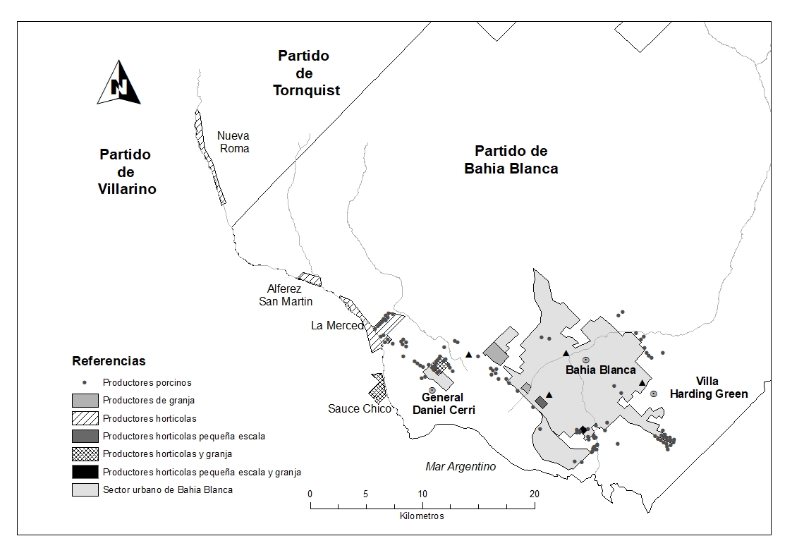 De acuerdo a lo expresado por el ingeniero agrónomo P. García de la Agencia de Extensión INTA- Bahía Blanca, el partido posee en la actualidad 37 productores hortícolas y 132 productores que se dedican a la cría de cerdos[1]. Los productores hortícolas se concentran en el área de General Daniel Cerri, Sauce Chico, Colonia La Merced y Alférez San Martin en el límite entre los partidos de Bahía Blanca y Villarino. En cuanto a los productores porcinos, su distribución territorial es más heterogénea pero pueden distinguirse distintas áreas de criaderos, principalmente en el Sur de la ciudad y en el Noreste. Esta distribución guarda una relación con los barrios y sectores con mayores niveles de marginalidad y vulnerabilidad social de la ciudad (Figura 1).