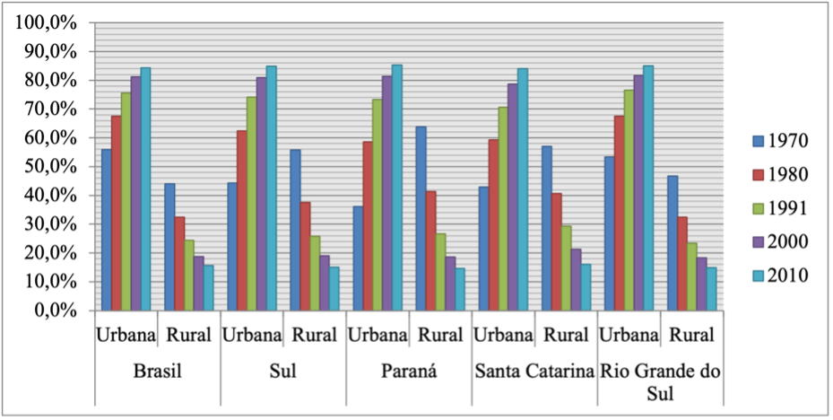 Pode-se ilustrar esse fato com informações do Instituto Brasileiro de Geografia e Estatística. Na figura 1, percebe-se que, de uma maneira geral, de 1970 a 2010 houve uma progressiva diminuição da população rural e de forma relacionada um progressivo aumento da população urbana[2] (IBGE, 2018). Essa constatação pode ser verificada tanto nos dados nacionais como nos três estados meridionais do país.