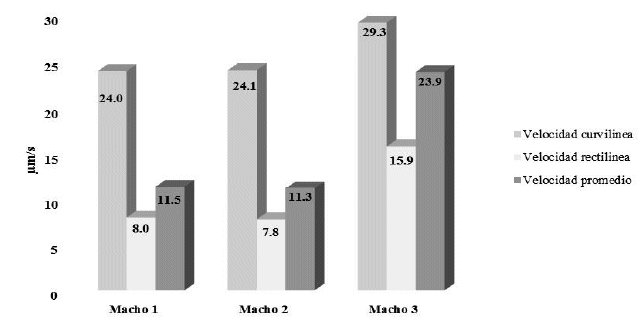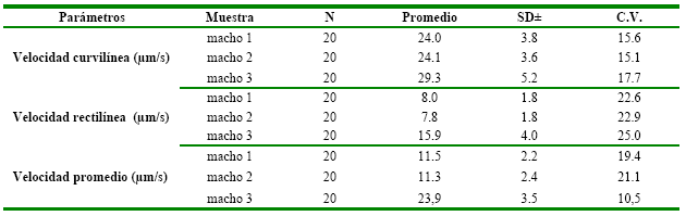 Los valores de VCL de 24.0 µm/s del macho 1, el macho 2, 24.1 µm/s alcanzando valores de 29.3 µm/s el macho 3, la diferencia pudo influenciar en el obtenido de los resultados, podría ser por el factor de temperatura. Los valores de coeficientes de variación para cada macho en la evaluación de la VCL varían desde un 15.6% para el macho 1 y un 15.1 % para el macho 2, sucesivamente a 17.7 % para el macho 3, se podría decir que los datos menores son más confiables para realizar la crioconservación.