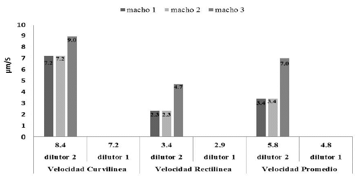 La VSL promedios fueron, macho 3 (4.7 µm/s), macho 2 (2.3 µm/s) y macho 1 (2.3 µm/s), con un coeficiente de variación para los 3 machos de 26.3 %, los promedios entre dilutores se puede observar la diferencia que existe ya el dilutor 2 obtuvo en promedio un 3.4 en los 3 machos esto resulto ser superior en los comparación al dilutor 1 que tuvo un promedio de 2.9 para los 3 machos y la VAP en el macho 3 (7.0 µm/s), macho 2 (3.4 µm/s) y macho 1 (3.4 µm/s), los promedios con el dilutor 2 fue 5.8 y el dilutor 1 4.8, con un coeficiente de variación para los 3 machos de 21.7 % en la VAP también se puede distinguir claramente la diferencia en los valores de los dilutores.