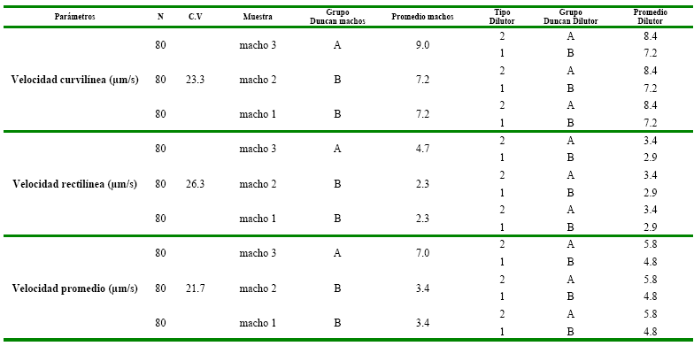 Los análisis de varianza para las velocidades de los spz a efecto de ser crioconservados con los dilutores 1 (AndroMed comercial) y el dilutor 2 (AndroMed comercial, gentamicina, ácido cítrico y glicerol), expresan diferencias entre los parámetros cinéticos (VCL, VSL y VAP), en los 3 machos, las diferencias significativas (p˂0.05), tabla 3.