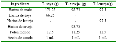 Tabla 1, preparación de tortas proteicas al 20% de proteína bruta, para 500 g mediante el método de tanteo se formuló la ración de cada tratamiento. De acuerdo a Somerville (2000), los requerimientos mínimos de los aminoácidos esenciales para la abeja (Apis melífera) son, treonina 3%, valina 4%, metionina 1.5%, leucina 4.5%, isoleucina 4%, fenilalanina 2.5%, lisina 3%, arginina 3% y triptófano 1%.