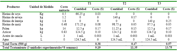 Se analizó el costo de producción total para la elaboración de 500 g de tortas proteicas de cada tratamiento Tabla 3. Al comparar los costos para la elaboración de los tratamientos obtuvimos que la torta a base de harina de soya (0.38 ctvs.) es la más económica en relación a las demás y a la ves influye positivamente en el rendimiento de la colmena.