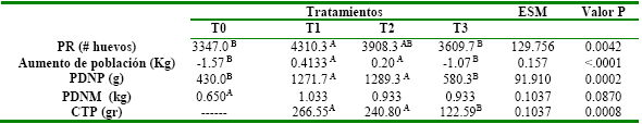 AB: Medias con letras diferentes en filas difieren significativamente (P>0.05). ESM: Error Estándar de la media.