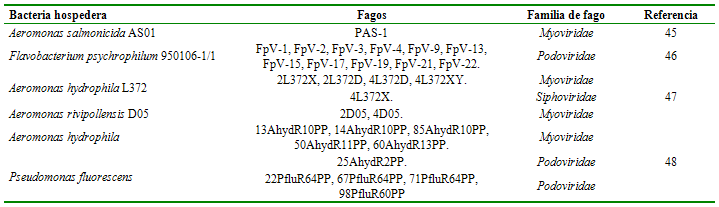 Fagos en acuicultura. Se ha justificado que los fagos pertenecientes a las familias Myoviridae, Podoviridae y Siphoviridae forman parte del microbioma intestinal de los peces, encontrándose en mayor cantidad los fagos templados que los líticos42. Los fagos utilizados en los diversos estudios fueron aislados del mar, ríos, lagos, aguas residuales y muestras de tejido (tabla 1 y 2), por lo que es razonable que los fagos aislados de medios líquidos tengan mejor desempeño suministrándolos en el agua que a través del alimento, la ventaja de usarlos en el agua es que controla las bacterias del ambiente (agua), de los animales en producción43,44.