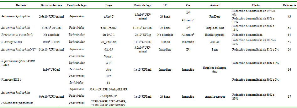 Así mismo, el intervalo de tiempo entre la infección y el tratamiento, la dosis empleada y la vía de administración influyen en los resultados (tabla 2). Si bien se han empleado en el alimento, por vía intraperitoneal e inmersión, la literatura señala que los mejores efectos protectores se observa cuando se aplica en la vía intraperitoneal, sin embargo, la forma más práctica en producción comercial es por inmersión o en el alimento43, pero la primera forma de aplicación es la que permite obtener los mejores resultados (tabla 2). Sin embargo, los fagos no forman parte de la formulación de la dieta alimenticia por lo que no pasan el proceso de extrusión, sino que el alimento se sumerge en fagos33.
