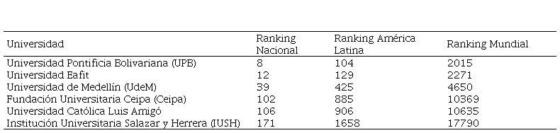 En la Tabla 1 se muestra el ranking mundial, latinoamericano y nacional de las IES que son objeto de esta investigación.