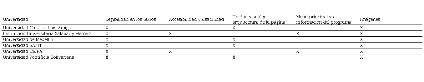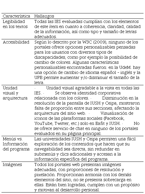 Imágenes: son significativas para atraer la atención de quienes visitan el sitio, deben cumplir con un propósito o intención (se describe algo). Deben cuidarse especialmente las características de resolución y tamaño, teniendo en cuenta los aspectos de accesibilidad que describe la W3C (2009). Con lo anterior, se presentan en la Tabla 3 y Tabla 4 los resultados extraídos de la comparación de las características de los seis portales web de las universidades seleccionadas.