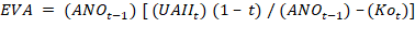 donde (UAIIt)(1 – t)/ANOt-1 es el rendimiento después de impuestos del activo neto operacional. A la diferencia entre el rendimiento después de impuestos del activo neto operacional ANO y el costo de capital medio ponderado KOt se le conoce como el porcentaje de utilidad o pérdida residual. La UAIIt es la utilidad antes de impuestos e intereses.