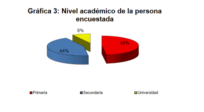 Sobre el nivel académico, el 48% solo contaba con estudios primarios, lo cual resulta comprensible por las pocas oportunidades que existían en la provincia de Colón hace más de 50 años para estudiar, aun los estudios primarios, por lo que muchas de estas personas no
