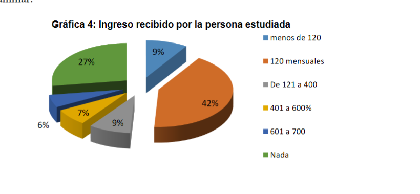 Como se puede observar en la siguiente gráfica la mayoría o sea el 42% recibía el subsidio del Estado, pero al preguntarle en qué lo usaban quedó claro que en algunos casos era la única fuente fija de la familia, por lo que todos dependían del ingreso del adulto mayor.