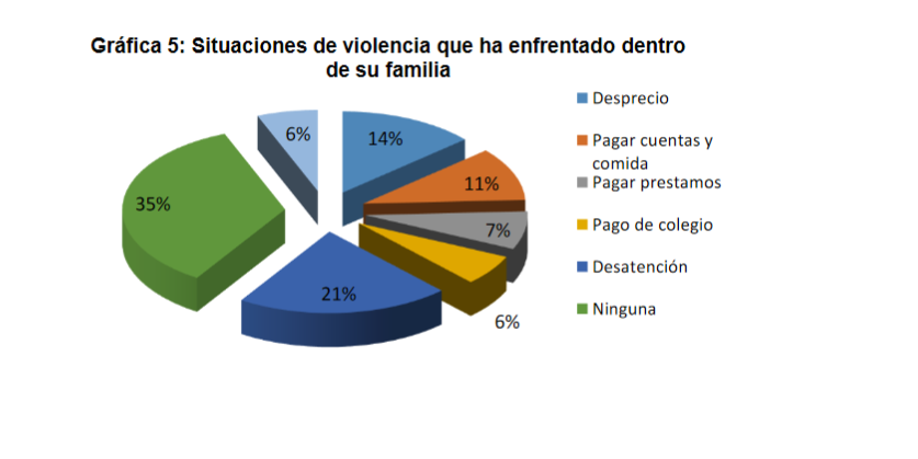 Solo el 35% de las personas estudiadas dijo que no había tenido ninguna experiencia de violencia dentro de su familia o en la casa donde residían. El resto mencionó diferentes episodios de violencia, desde desprecio, quitarle su habitación, sentirse obligado a pagar todas las cuentas del hogar o gran parte de ellas, comprar la comida para todos, hacer préstamos donde queda la jubilación embargada por muchos años por los altos montos de los intereses que todos sabemos ocurre en nuestro país.