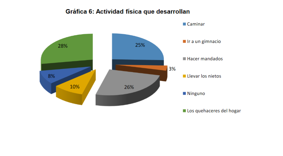 Entre las personas estudiadas predominó la inactividad física como actividad programada y llevada a cabo de forma controlada y con asesoramiento profesional. Para algunos tanto hombres como mujeres la única actividad que desarrollan son los quehaceres domésticos o ir a hacer compras o mandados relacionados con las necesidades de la familia, como, por ejemplo, pagar cuentas, llevar ropa a lavandería, planchar, recoger y llevar niños a la escuela, etc. Realizando estas actividades es cuando caminan. En ningún caso tomaban un tiempo para caminar en función de ejercitarse.