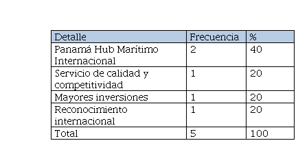 Al preguntarse por qué apoyarían esta iniciativa, cada uno proporcionó su opinión por separado e indicando en un 40% (2 personas) que apoyarían para que Panamá sea un hub marítimo internacional; el 20% (1 personas) dijo que para dar servicio de calidad y competitivo, otro 20% (1 personas) mencionó que para mayores inversiones y el último 20% (1 personas) considera un reconocimiento internacional, tal como se presenta en la Tabla 1.