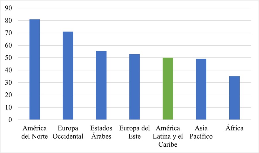 En cuanto a las TIC y su utilización intensiva en la gestión, América Latina y el Caribe se ubican en una posición intermedia, en comparación al desarrollo de los ecosistemas digitales de otras ubicaciones del mundo (CAF – Banco de Desarrollo de América Latina, 2020). En este sentido, en una escala de 0 a 100, posee un índice de 49.925, lo que le otorga un mayor grado de avance respecto a África (35.05) y Asia Pacífico (49.16), pero la ubica por detrás de Europa Occidental (71.06), América del Norte (80.85), Europa del Este (52.90) y los Estados Árabes (55.54). Asimismo, la tasa de crecimiento anual de este índice es menor a la de otros territorios (Fig. 6).