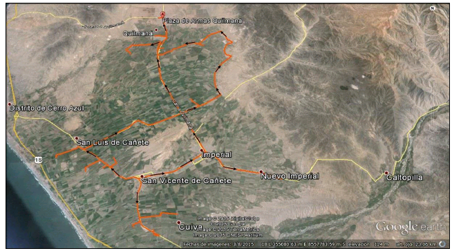 El área de estudio corresponde al Valle de Cañete, Departamento de Lima, Perú (13°04′42″ LS 76°23′02″ LO). De las 55 fincas productoras de aguacate y/o mandarina, pertenecientes a miembros de la Asociación de Agricultores de Cañete, se escogieron al azar 48 fincas como localidades de estudio, mediante el método de proporciones recomendado por Julca et al. (2006). El cultivo de mandarina fue el principal en 24 de las fincas visitadas y secundario en cinco, lo cual representó un total de 29 fincas que poseen dicho cítrico. En el caso del aguacate, fue el cultivo principal de 19 de las fincas visitadas y el secundario en cuatro, haciendo un total de 23 fincas con cultivo de este frutal. Las fincas estuvieron distribuidas en los distritos de San Vicente, San Luis, Quilmaná, Imperial y Nuevo Imperial (Figura 1).